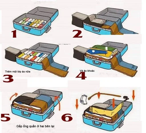 Xếp đồ nặng dưới cùng, đồ nhẹ lên trên. Không mang ô dù vào mùa mưa. Sử dụng mỹ phẩm mini để tiết kiệm không gian. Cuộn quần áo thay vì gấp để tiết kiệm chỗ. Dùng túi hút chân không để giảm kích thước đồ mang theo.
